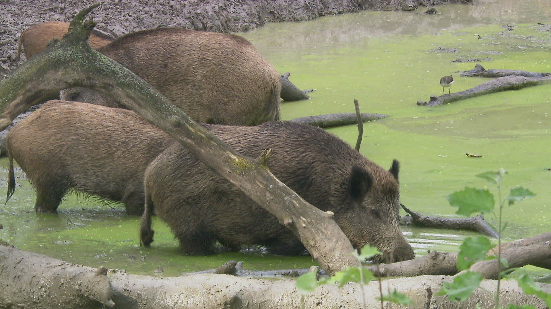 MS PAN Wild boars (Sus scrofa) standing in river / Russia