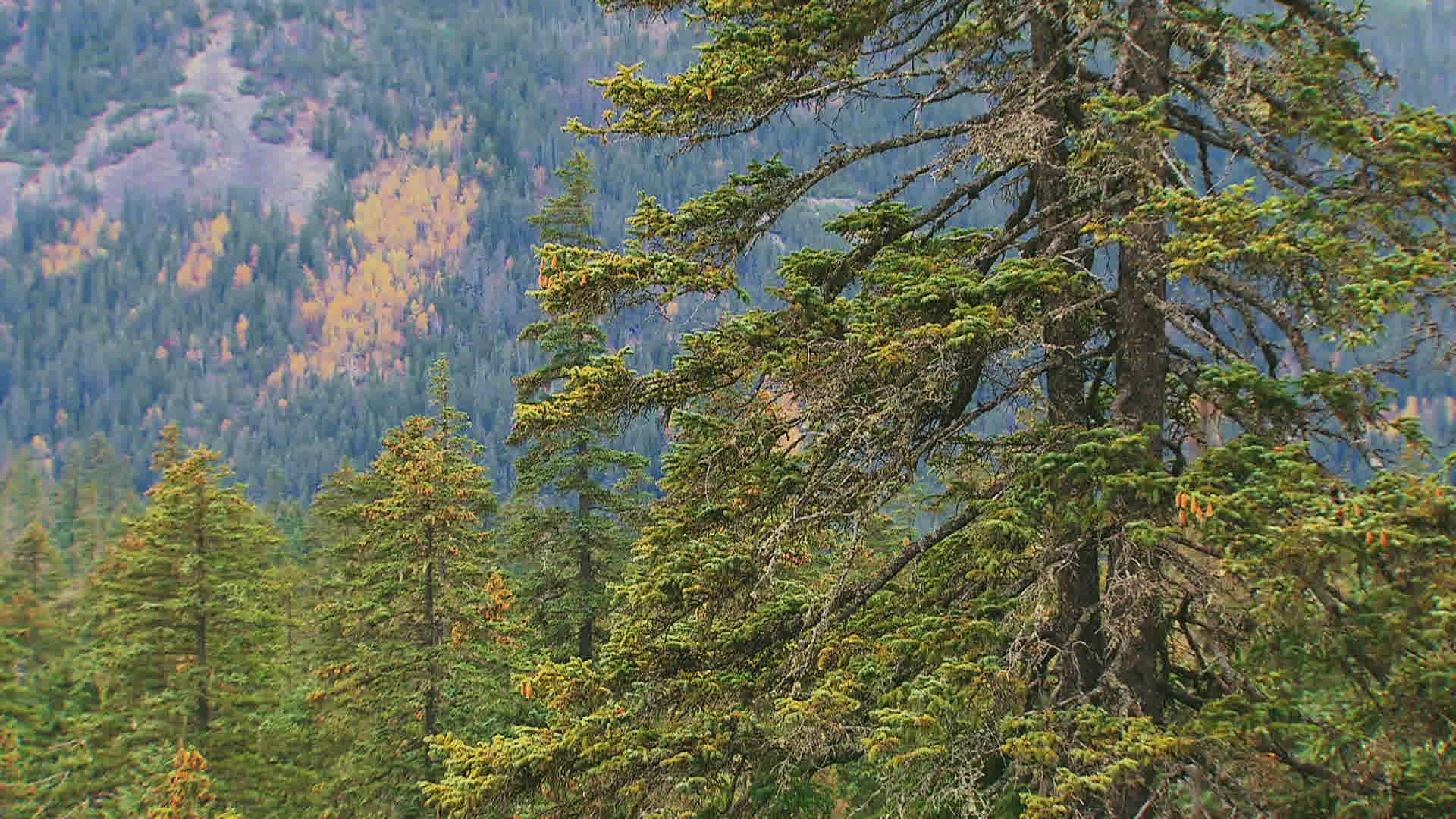MS Coniferous tree on windy day; Amur river basin / Russia
