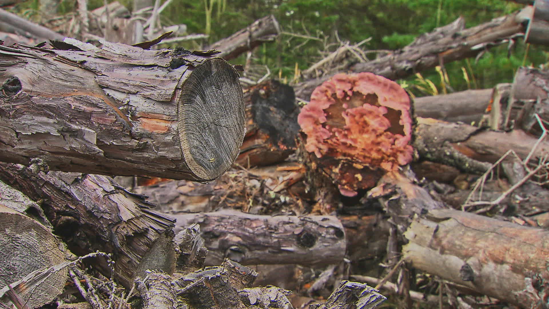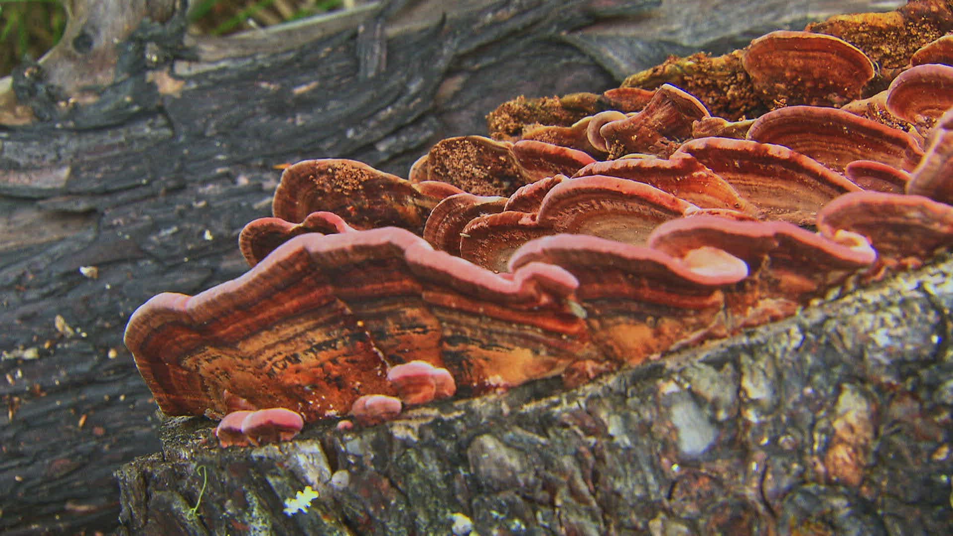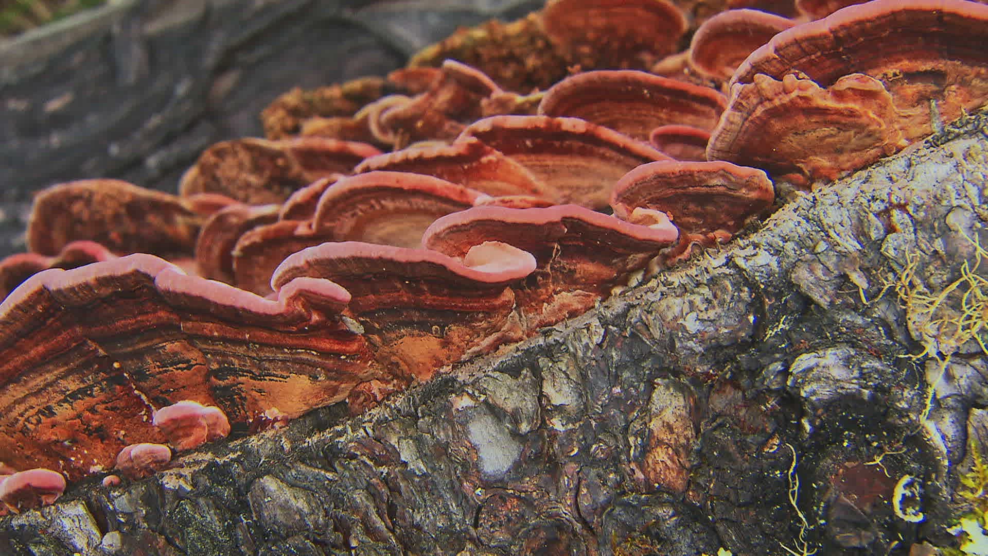 CU R/F Yellow Polypores on tree trunk; Inner Mongolia / China