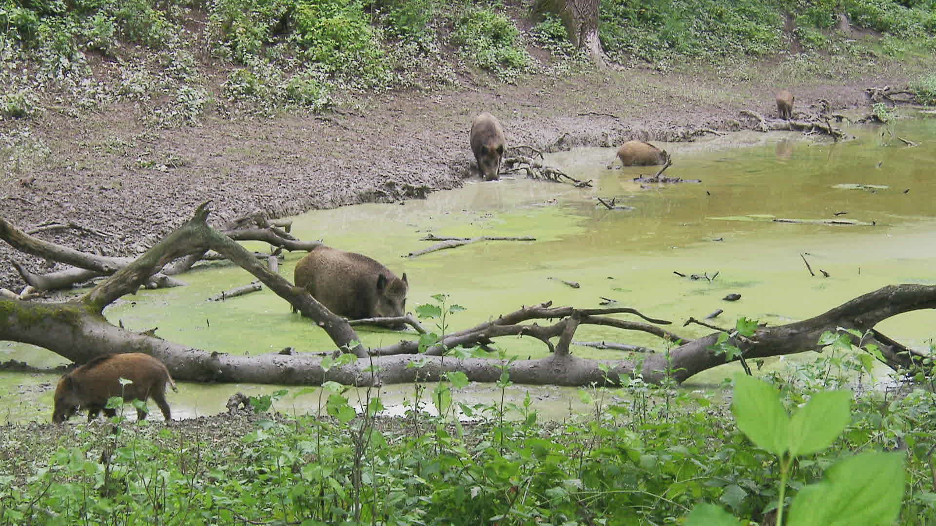 WS Wild boars (Sus scrofa) standing in river / Russia