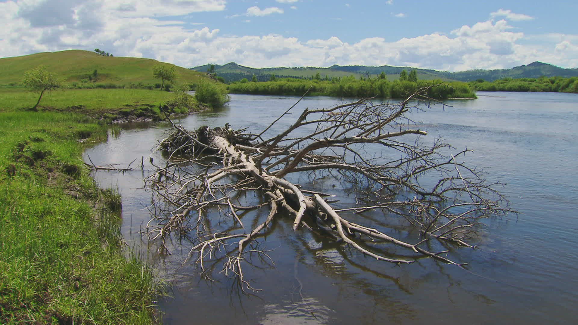WS PAN Landscape with dry tree in river / Mongolia