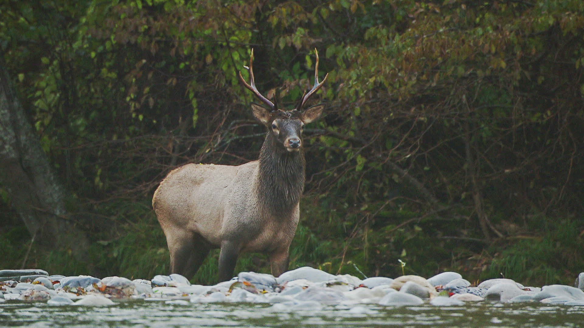 MS SELECTIVE FOCUS Sikha deer (Cervus nippon) standing by river; Amur river basin / Russia