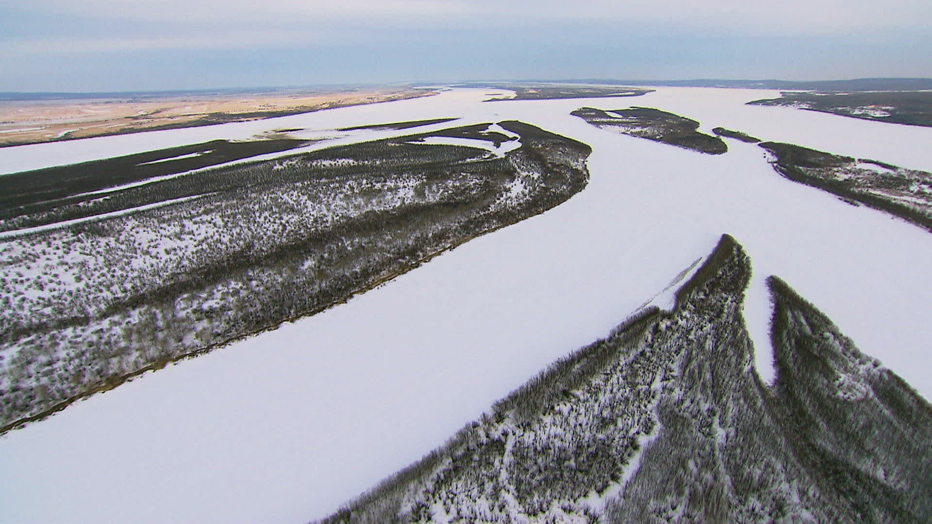 WS AERIAL VIEW Winter landscape with frozen Amur river / Russia