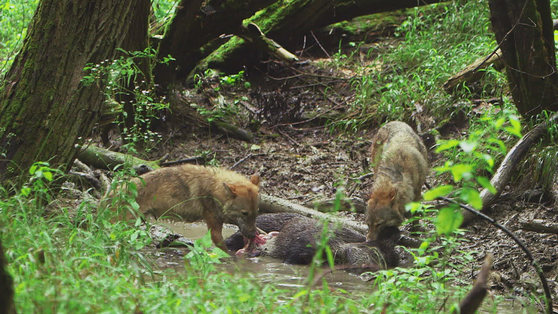 WS SELECTIVE FOCUS Wolves (Canis lupus) feeding on dead wild boar (Sus scrofa) in river / Russia