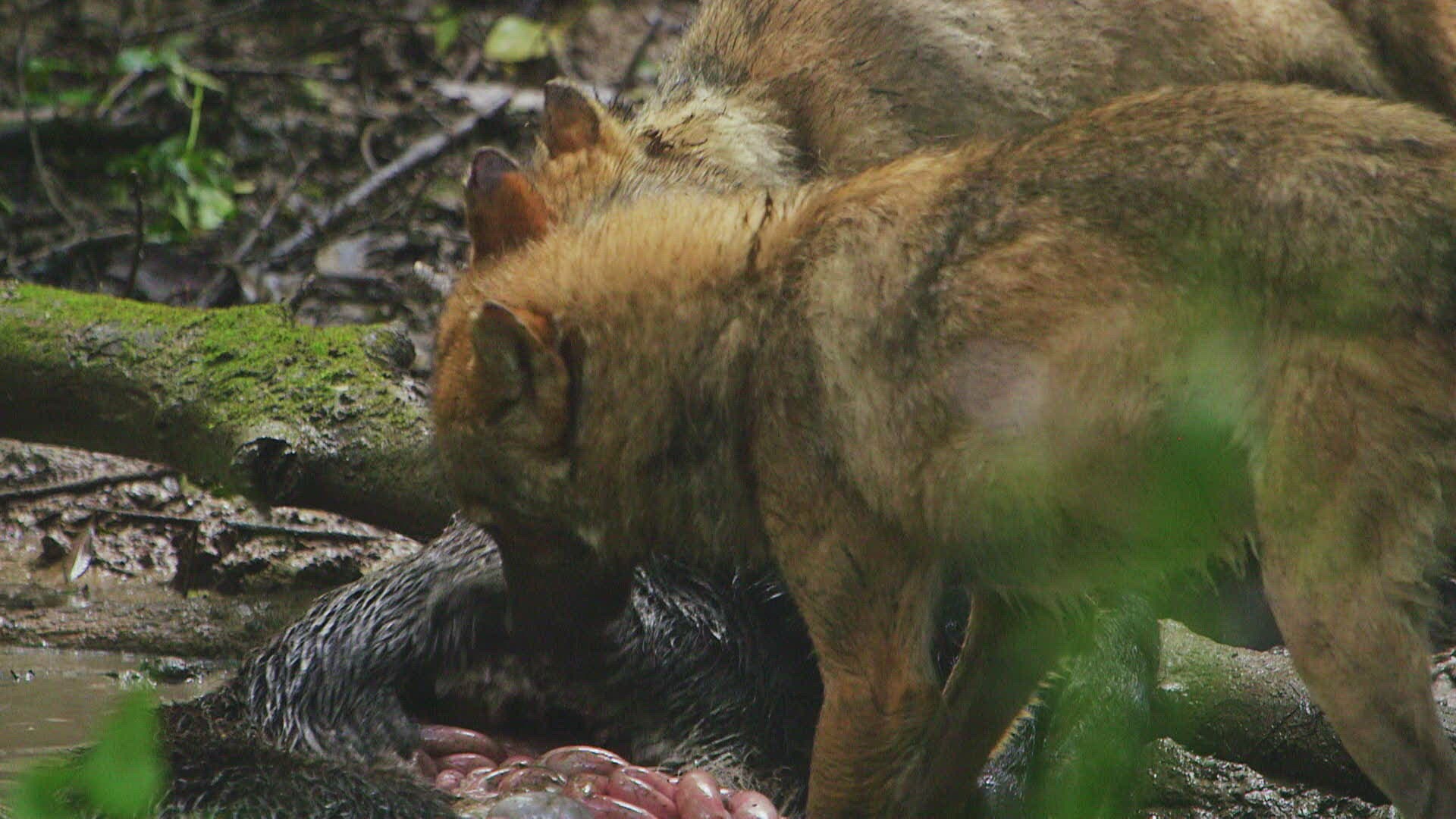 MS SELECTIVE FOCUS Wolves (Canis lupus) feeding on dead wild boar (Sus scrofa) in river / Russia