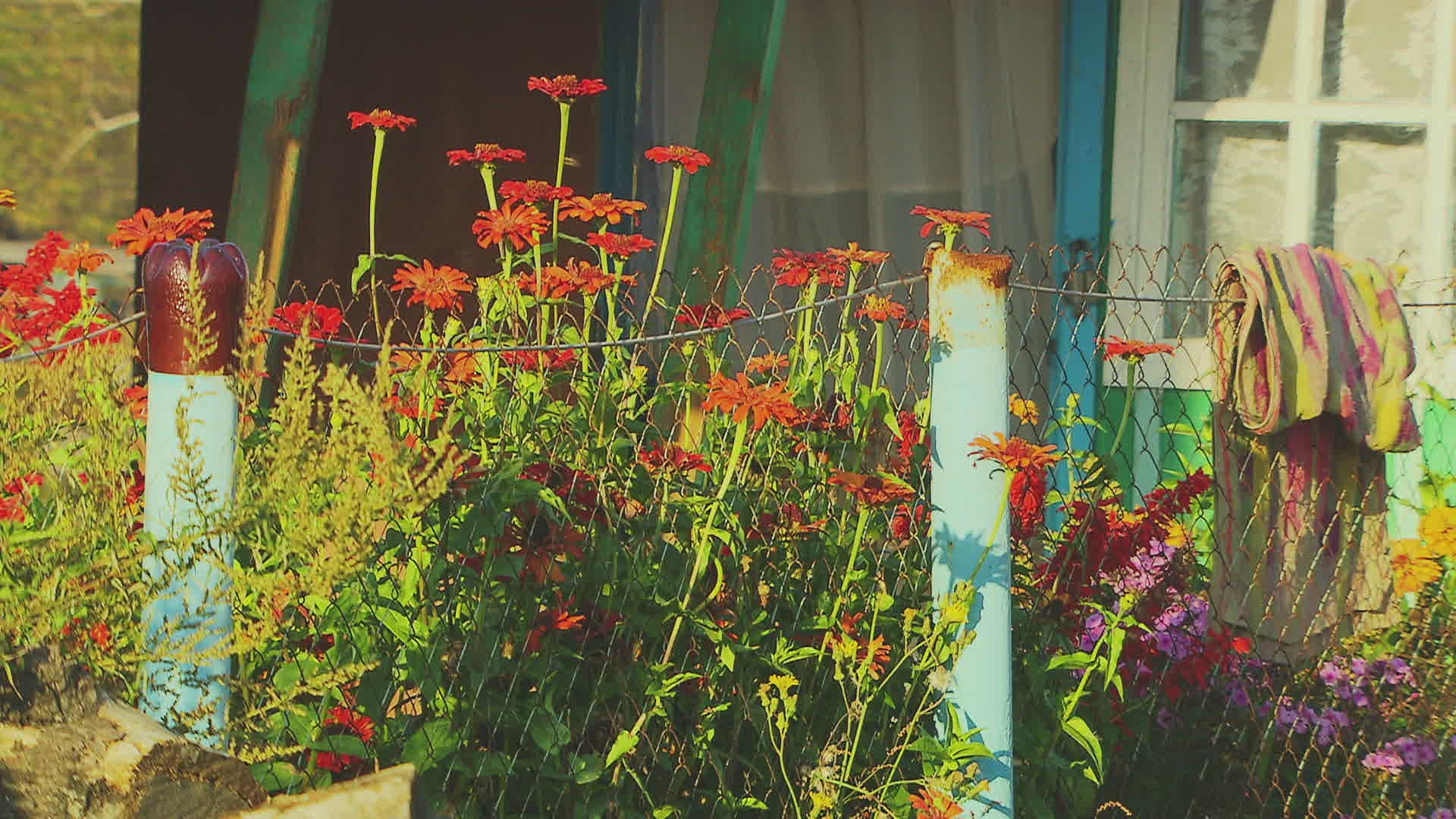 MS Red flowers growing behind fence; Transbaikalia / Russia