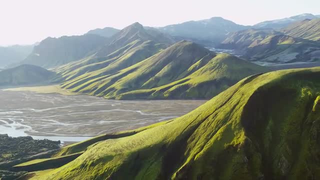 Aerial mountain volcanic region glacial movement erosion meltwater river deltas Landmannalaugar Highlands nature tourist destination Iceland RED EPIC