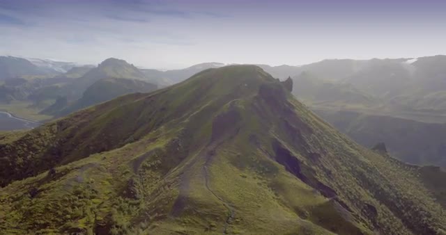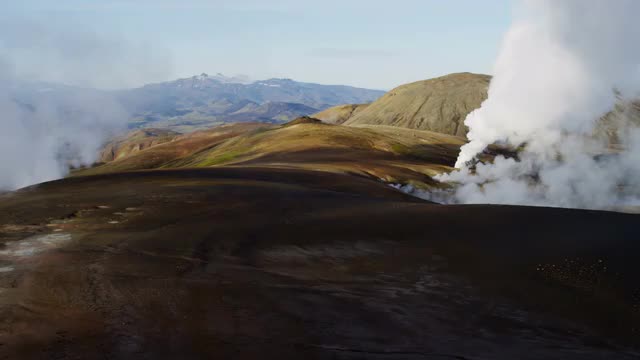 Aerial fertile valley volcanic peaks basalt lava Landmannalaugar Iceland
