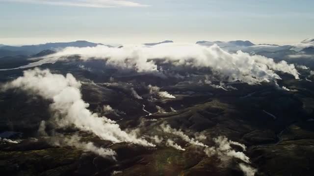 Aerial fertile valley volcanic peaks basalt lava rock glacial meltwater river deltas Landmannalaugar National Park Iceland RED EPIC