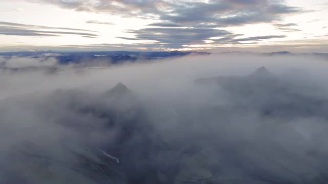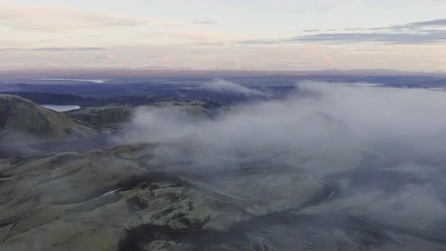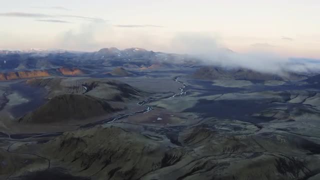 Aerial basalt volcanic rock flow cooled volcano area environment Landmannalaugar National Park Wilderness Iceland Arctic Region RED EPIC