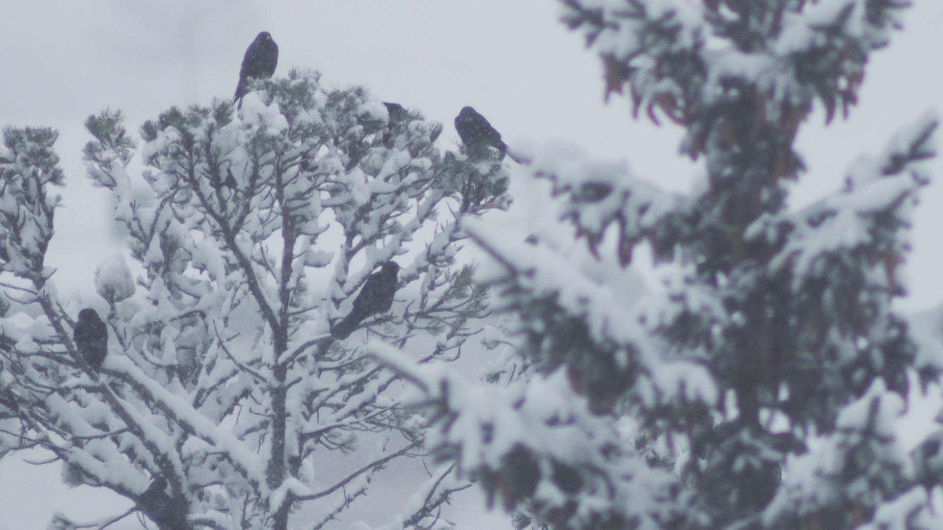 SLO MO WS Birds perching on tree in falling snow / Davos; Graubunden; Switzerland