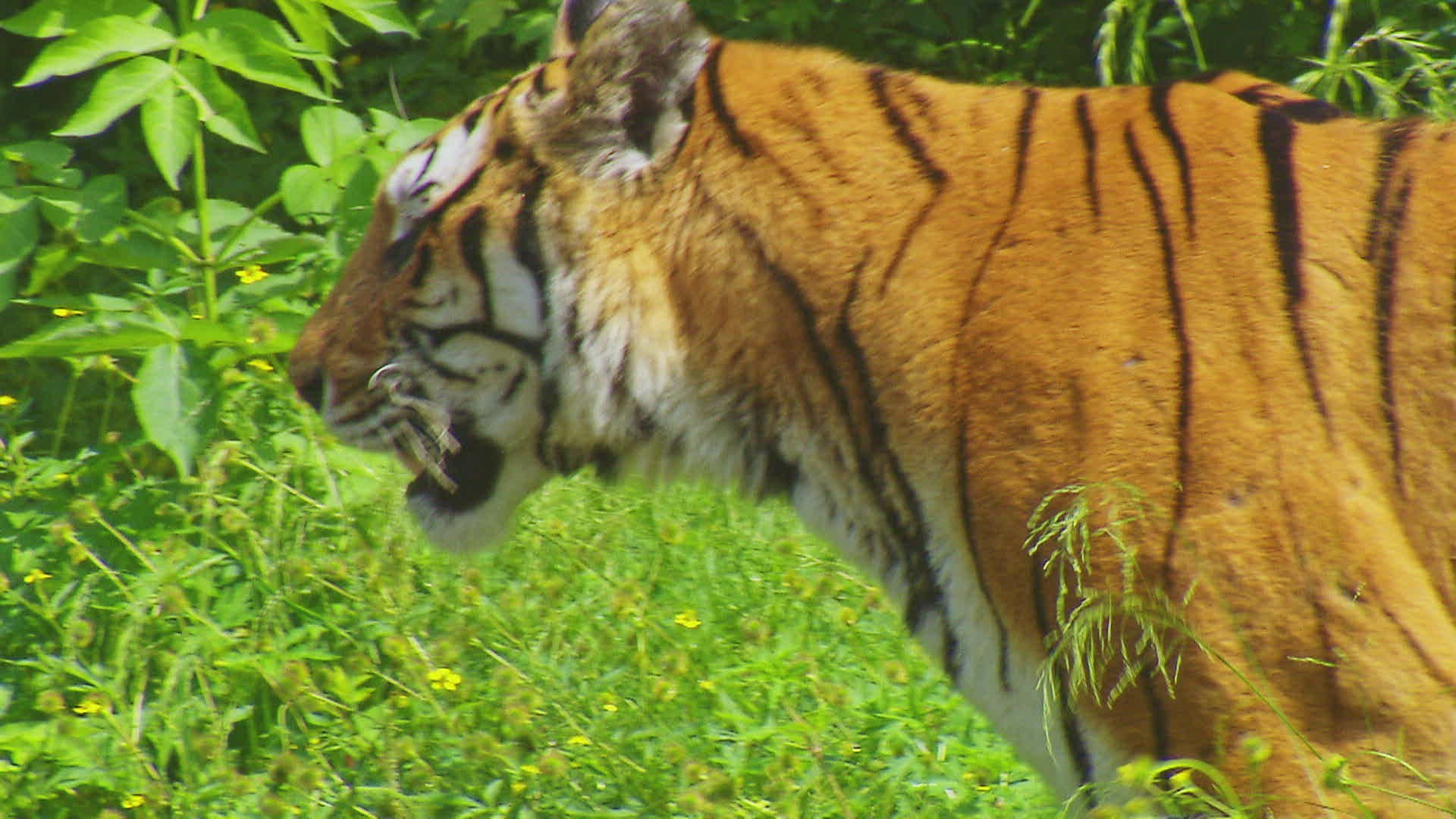 MS TS Tiger (Panthera tigris altaica) walking in meadow / China