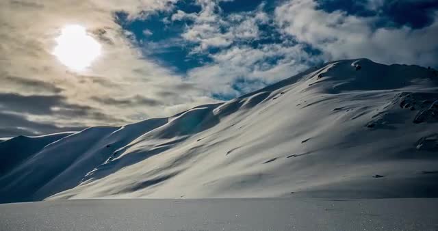 Motion control time-lapse of intact snow in the foreground and mountains view in the background with moving clouds. OTHER FRAME RATE AND RAW .RW2 PICTURES ON REQUEST