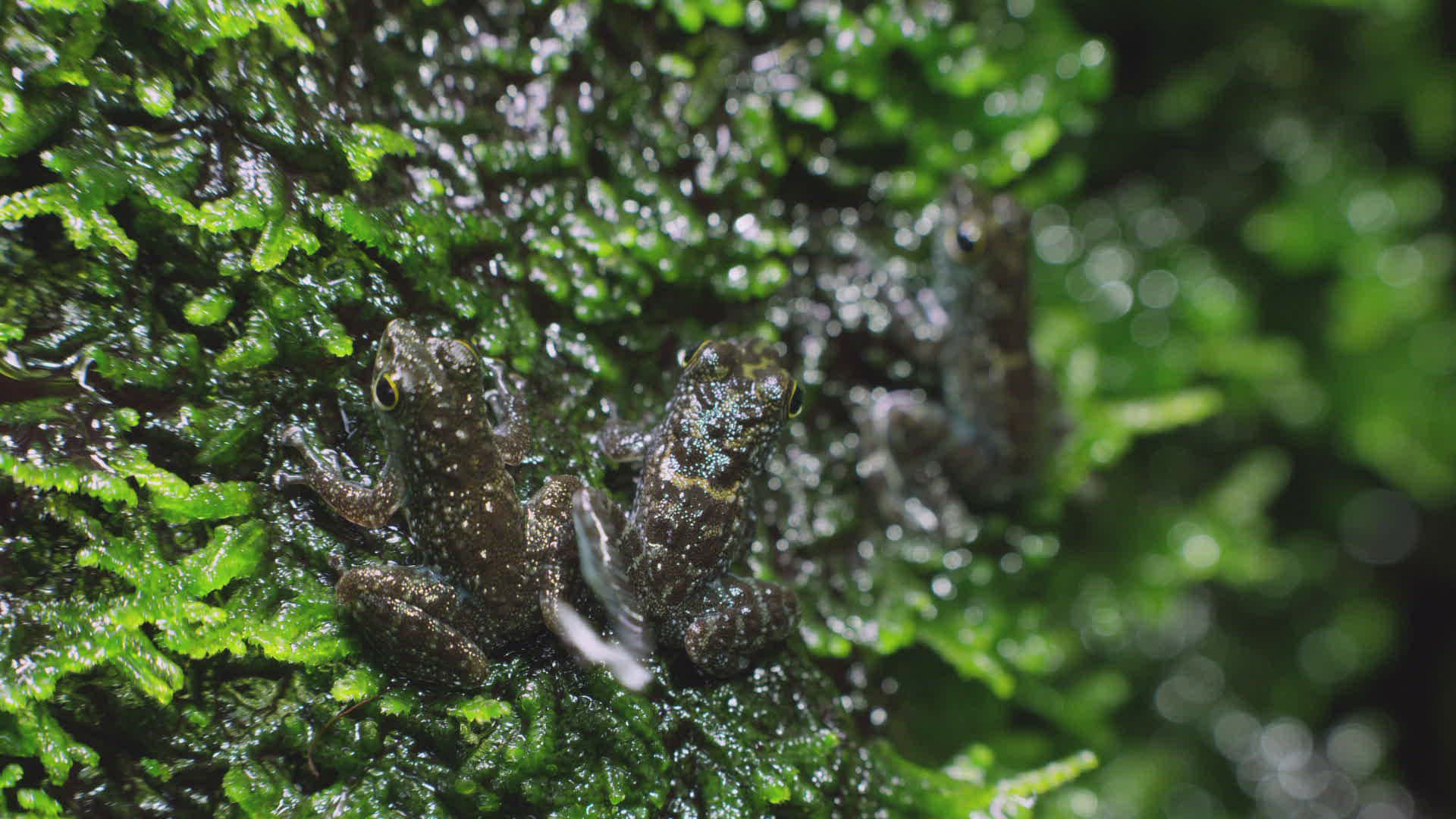 MS Three Bornean Rock Frogs (Staurois parvus) on wet rock / Borneo; Indonesia