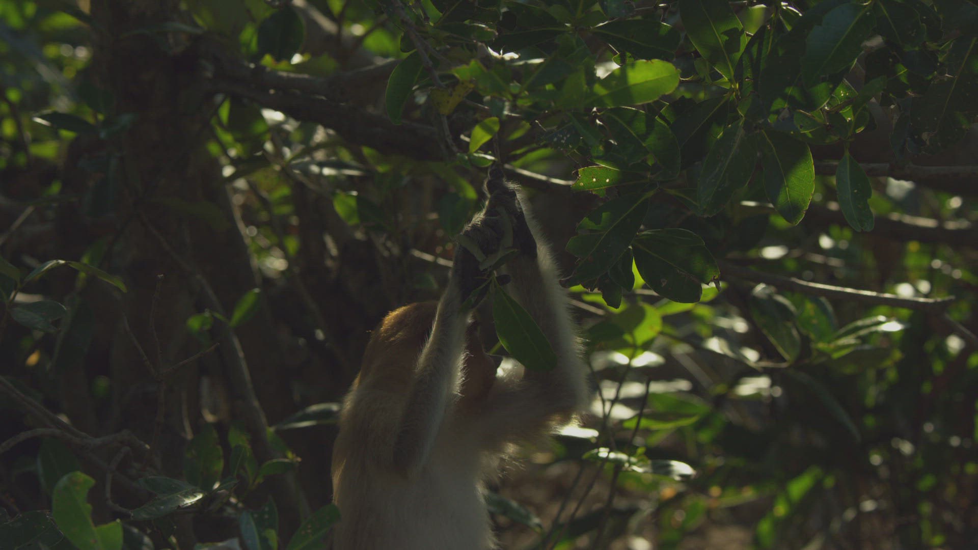 MS Proboscis Monkey (Nasalis larvatus) hanging on tree branch / Indonesia