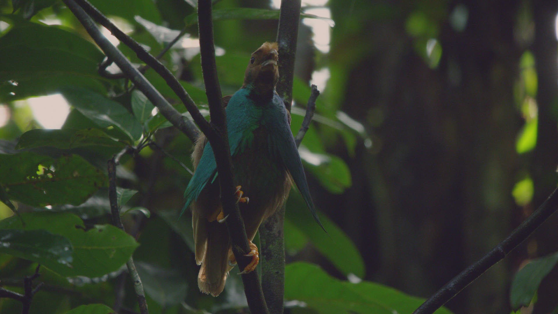 MS SELECTIVE FOCUS LA Wallace's Standardwing Bird-of-Paradise (Semioptera wallacii) jumping on branch / Halmahera; Indonesia