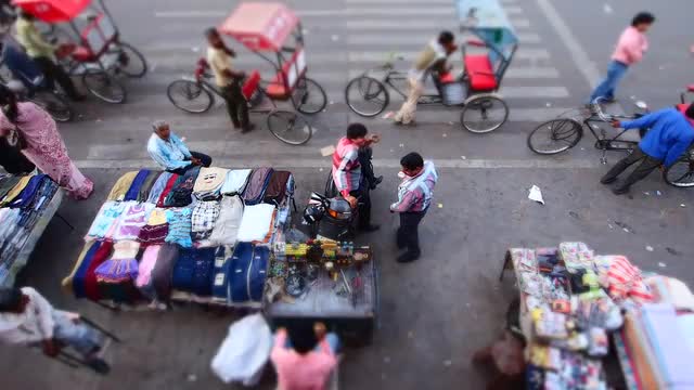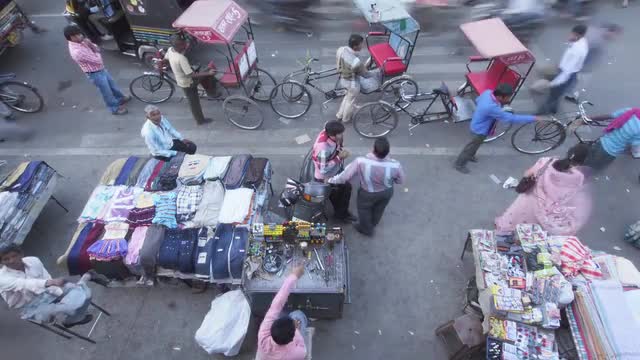 Pedicabs with drivers next to market stalls in Jodhpur, Rajasthan, India