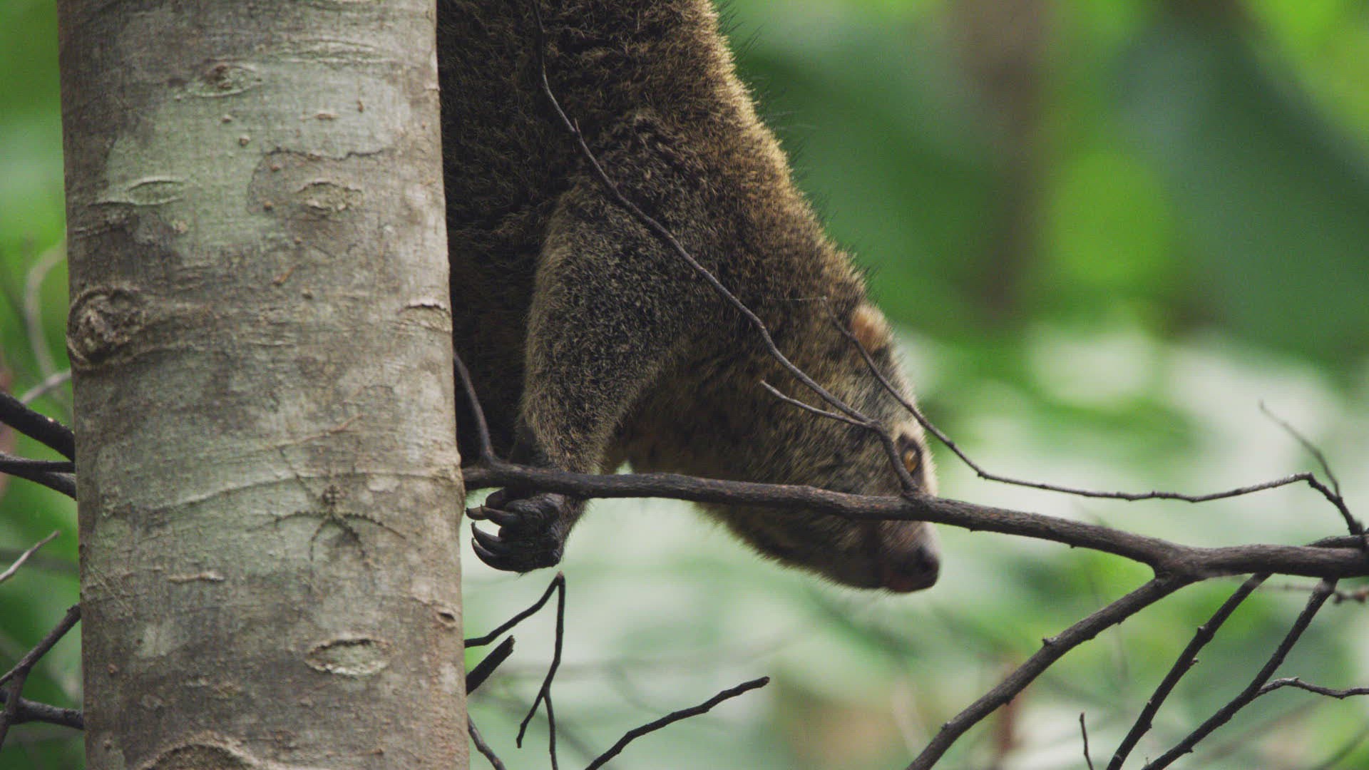 CU Sulawesi Bear Cuscus (Ailurops ursinus) hanging on tree / Sulawesi; Indonesia