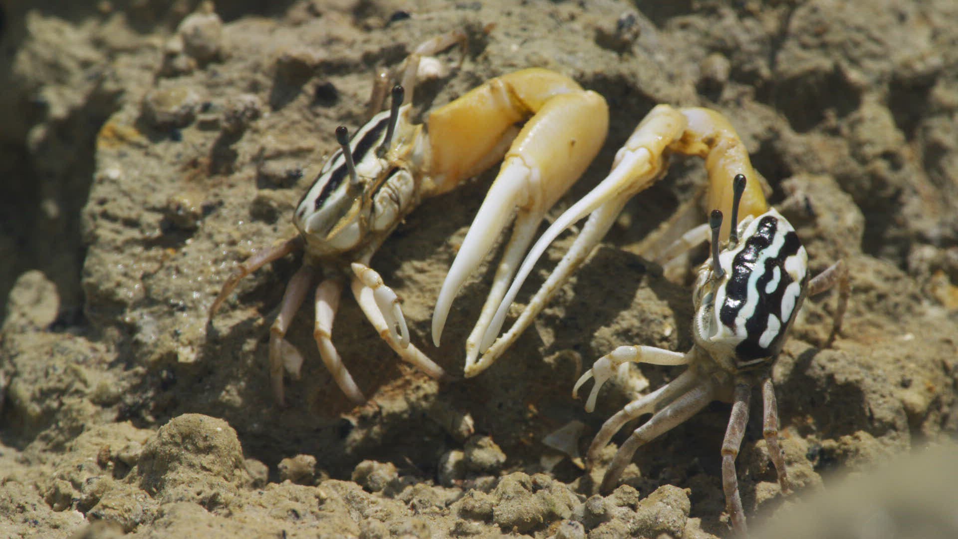 MS SELECTIVE FOCUS Perplexing Fiddler Crab (Uca perplexa) fighting on beach / Indonesia