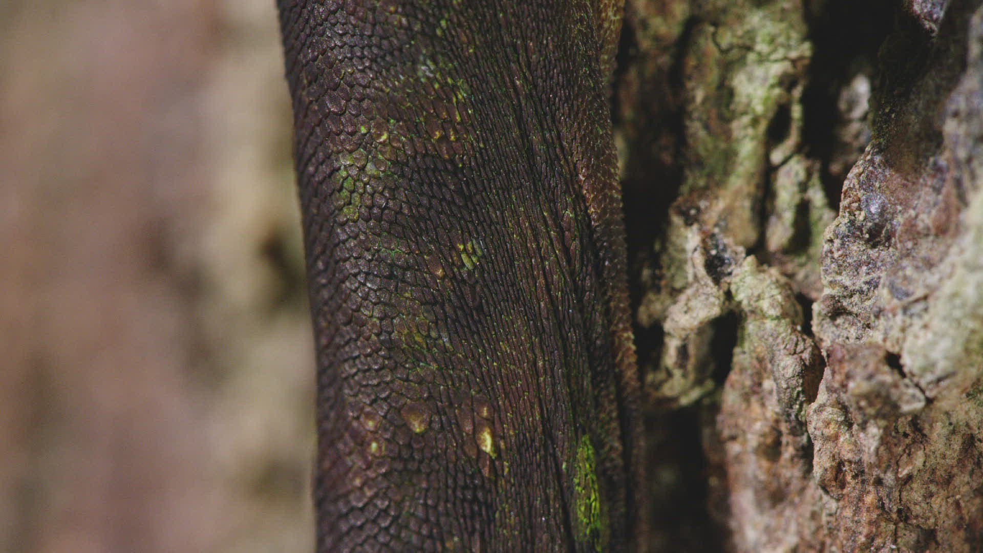 CU TU Crested Lizard (Agamidae) sitting on tree trunk / Indonesia