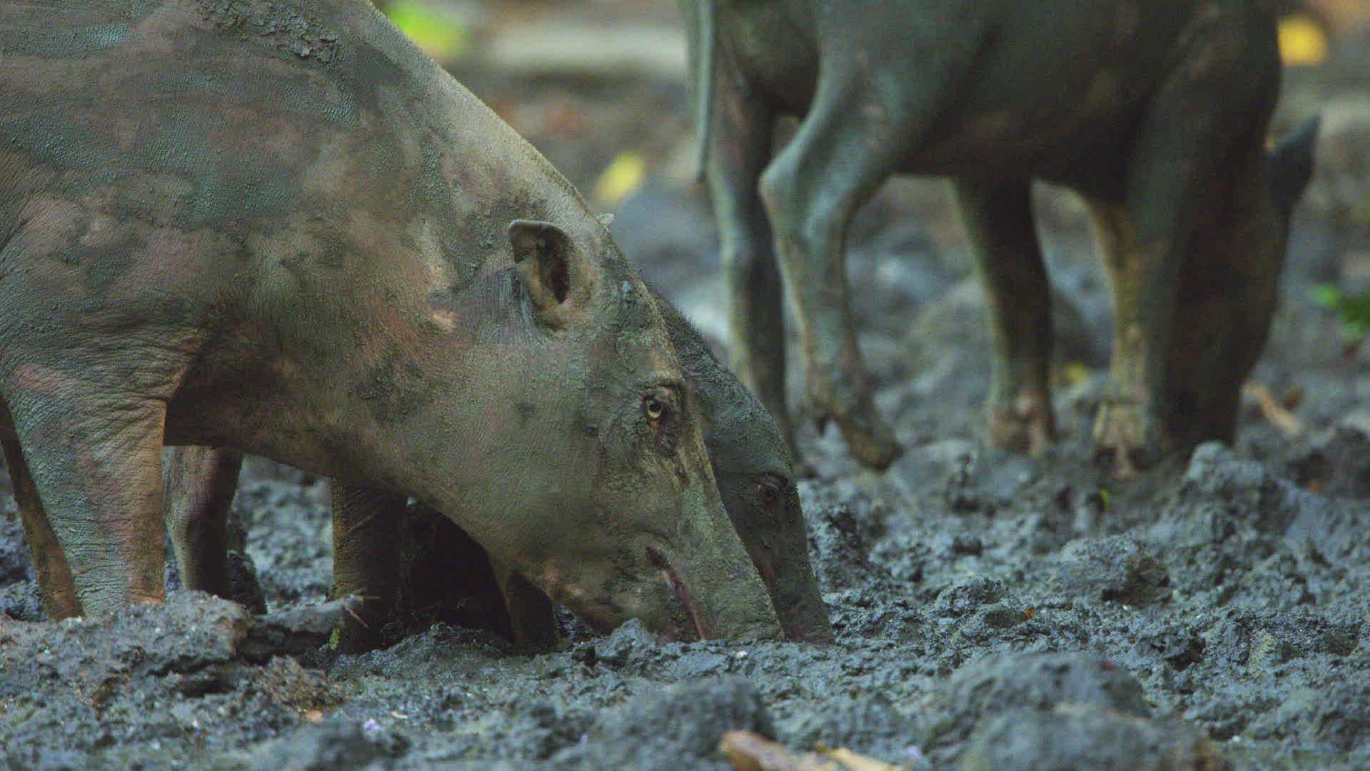 MS Babirusa (Babyrousa celebensis) drinking and foraging with young / Sulawesi; Indonesia