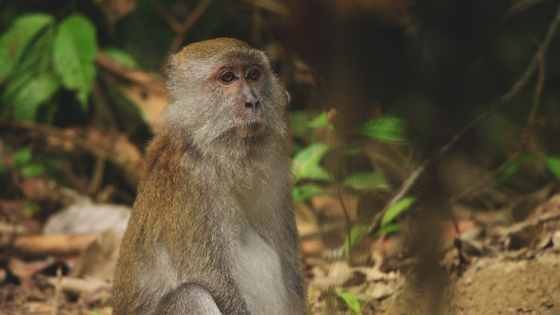 MS SELECTIVE FOCUS Watchful Long-tailed Macaque (Macaca fascicularis) sitting and running / Sumatra; Indonesia