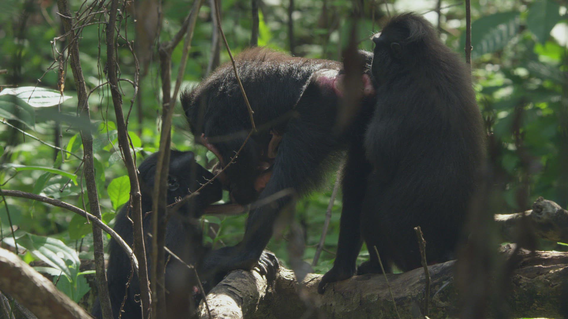 MS SELECTIVE FOCUS Young Sulawesi Crested Macaques (Macaca nigra) grooming each other / Sulawesi; Indonesia