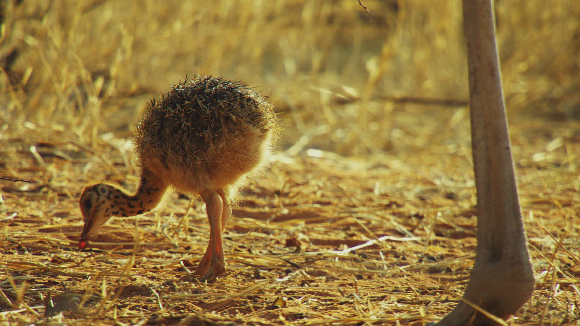 MS Small ostrich (Struthio camelus) eating leaves and seeds; Kalahari Desert / Namibia