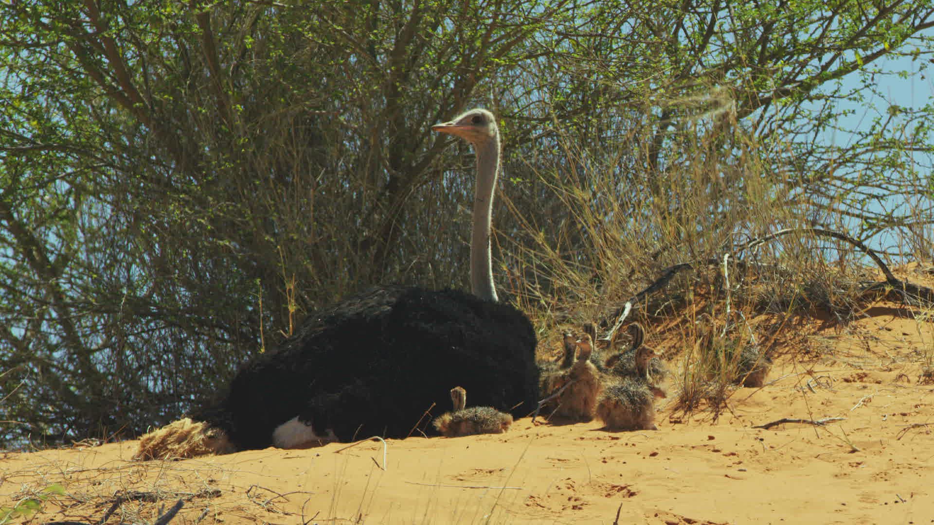 MS Ostrich (Struthio camelus) protecting young; Kalahari Desert / Namibia