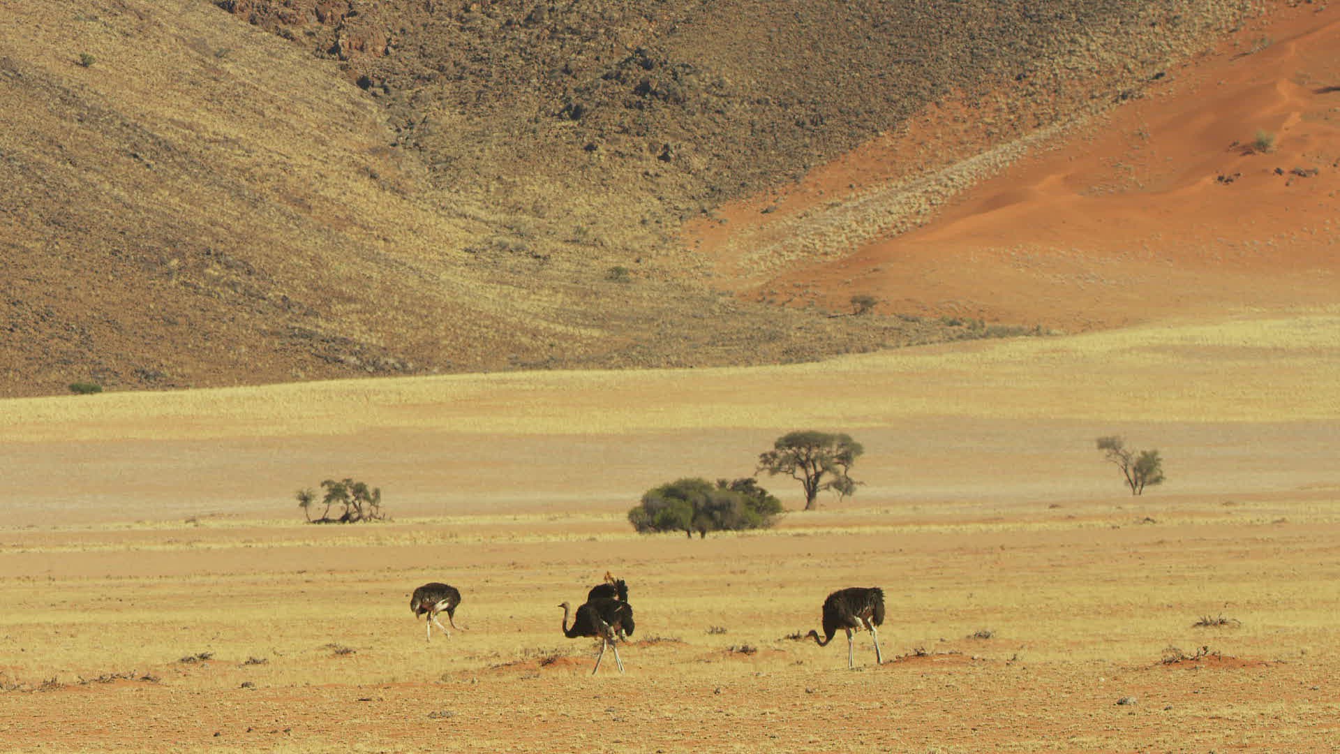 WS Ostriches (Struthio camelus) looking for food in savannah; Namib Desert / Namibia