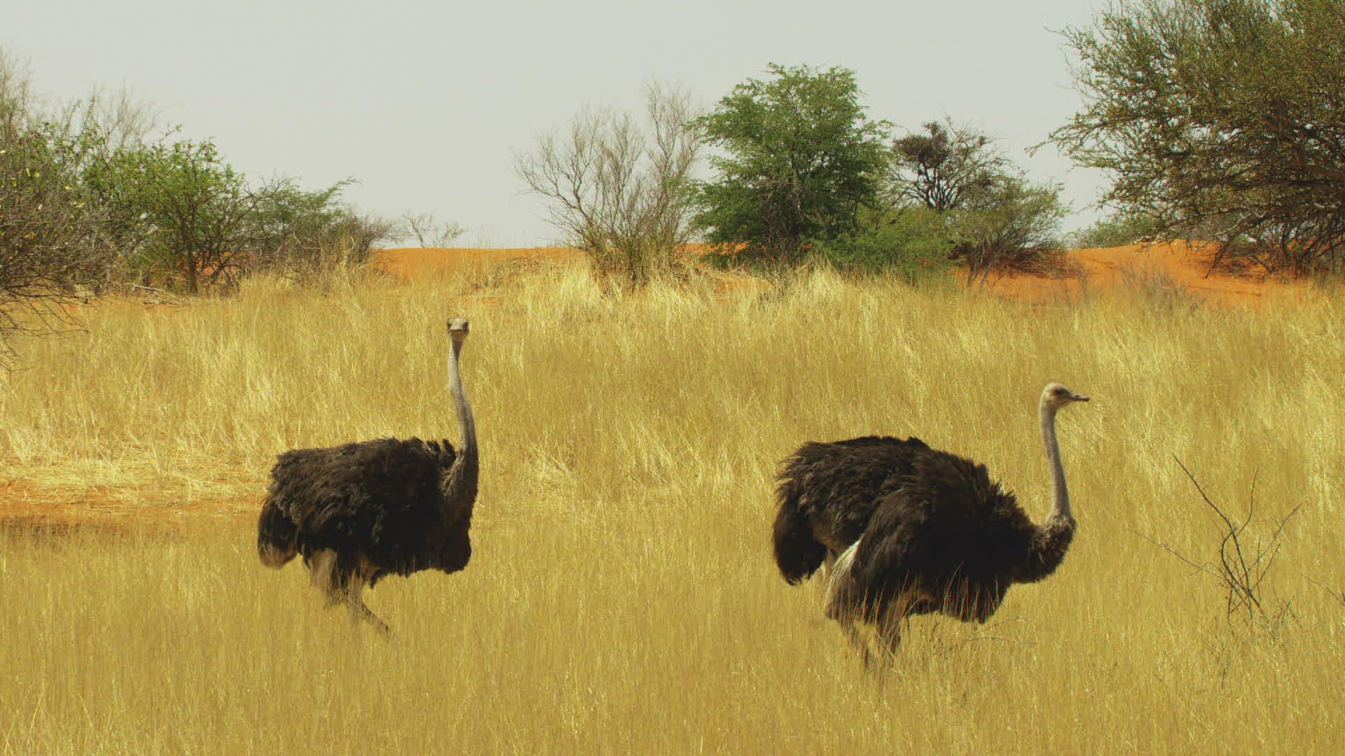 WS Ostrich (Struthio camelus) walking through Kalahari Desert / Namibia