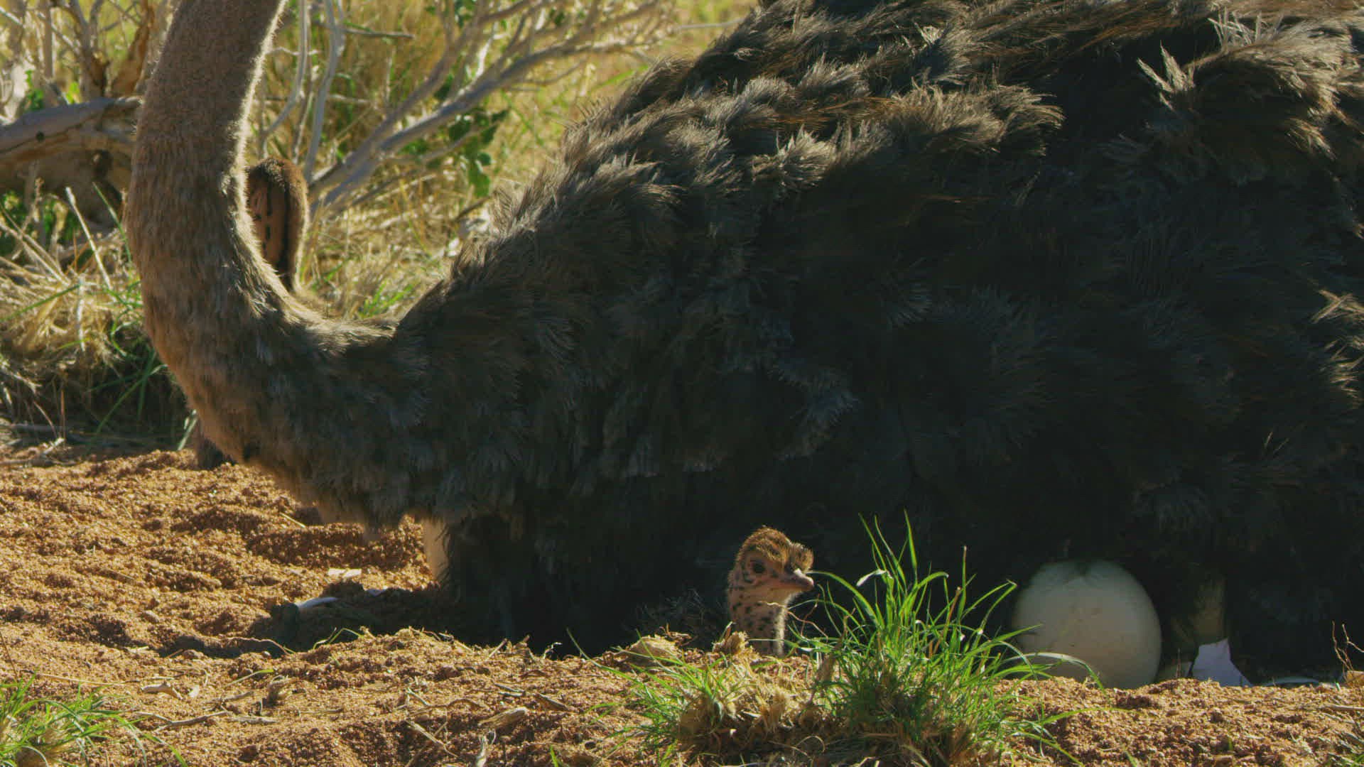 MS Ostrich (Struthio camelus) taking care of nest and babies; Namib Desert / Namibia