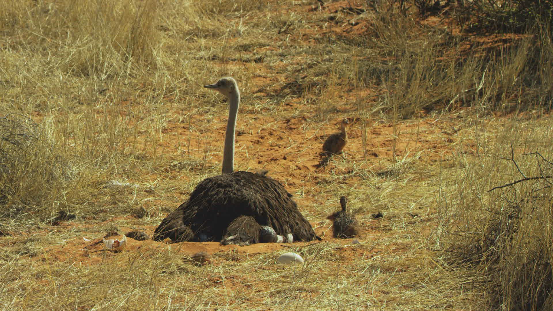 MS Ostrich (Struthio camelus) sitting in grass with young chicks in Kalahari Desert / Namibia