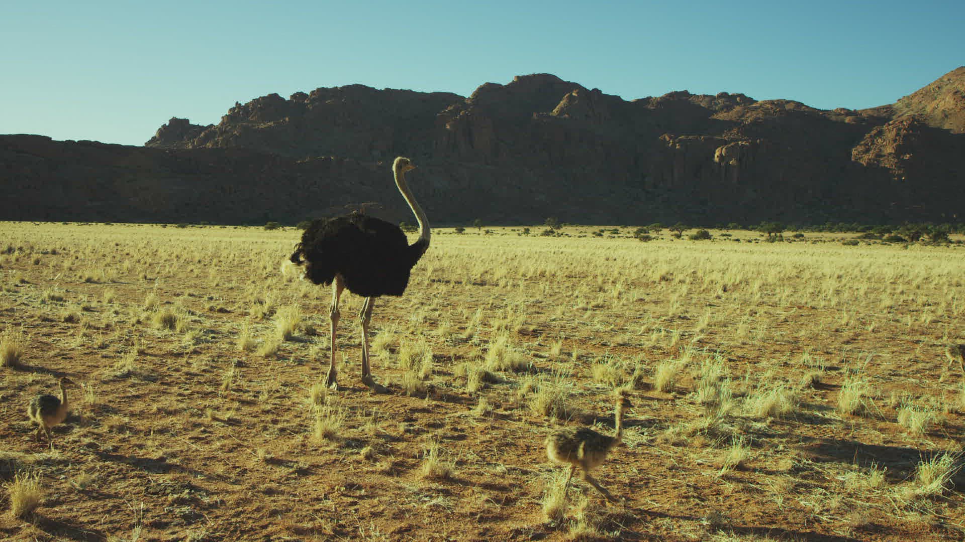 WS Ostrich (Struthio camelus) family grazing in grass area; Kalahari Desert / Namibia