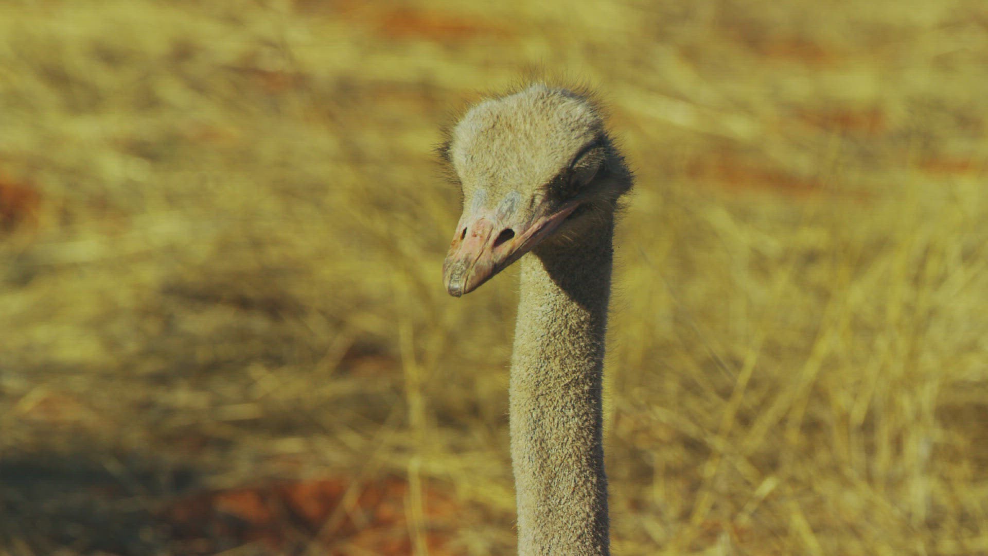 CU Sleepy ostrich (Struthio camelus) with fly walking on head; Kalahari Desert / Namibia