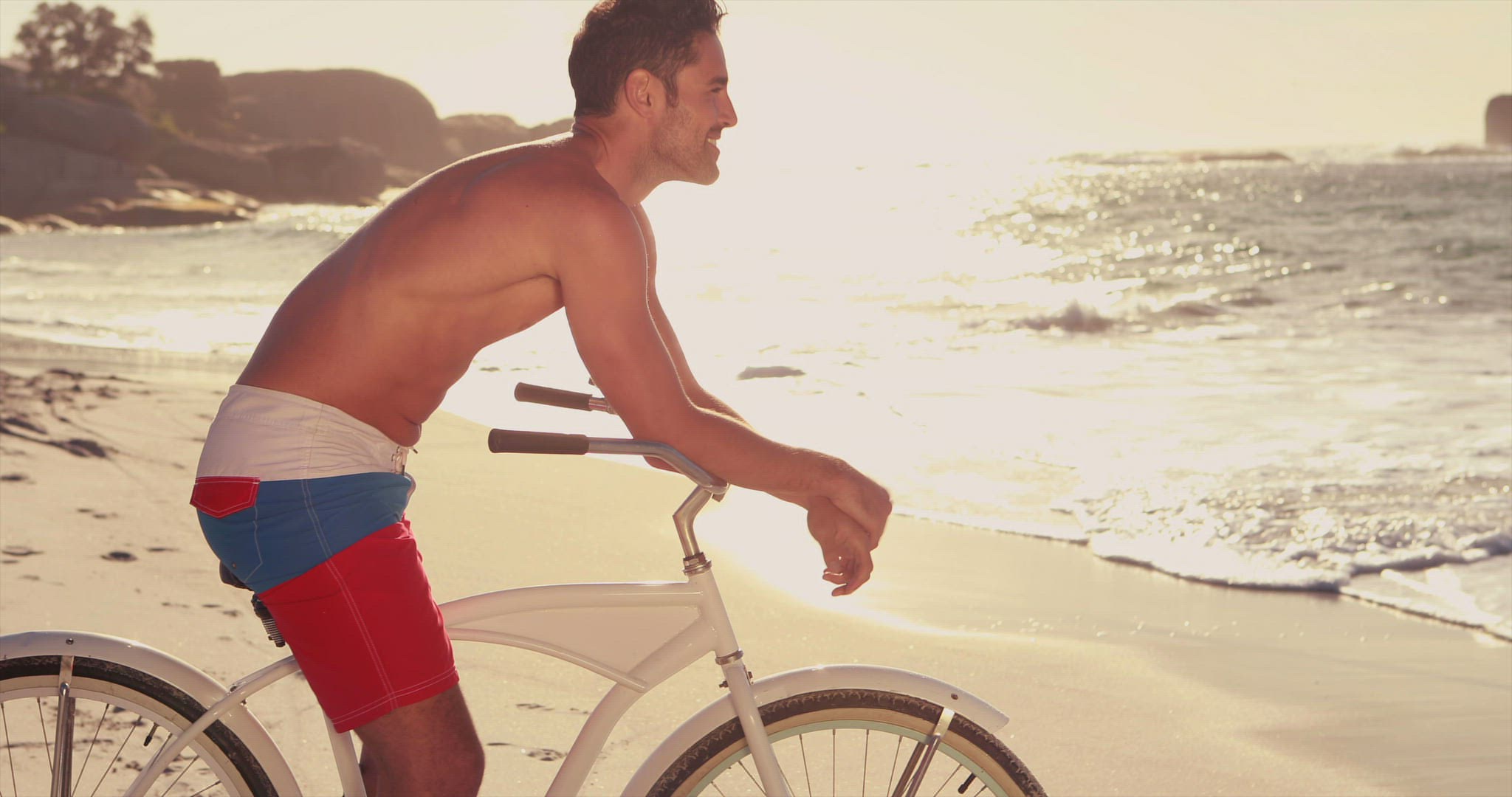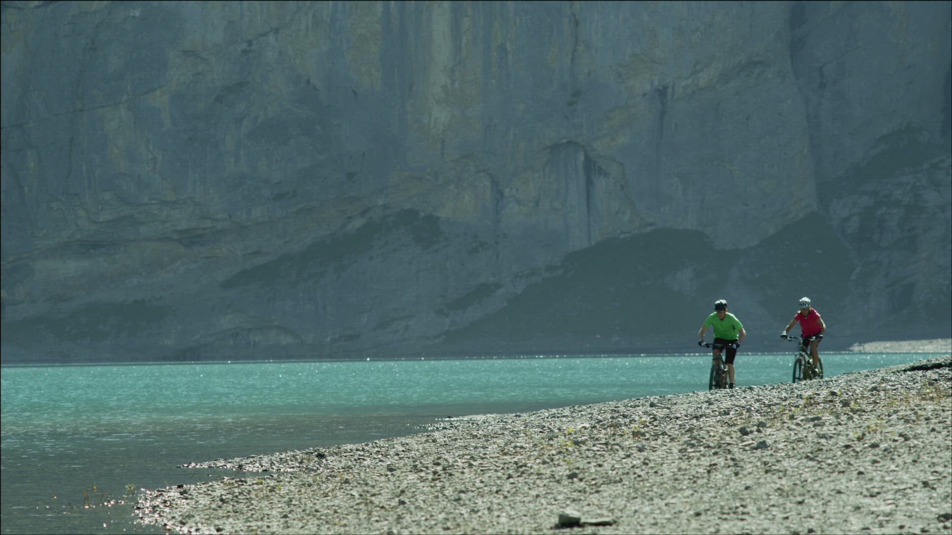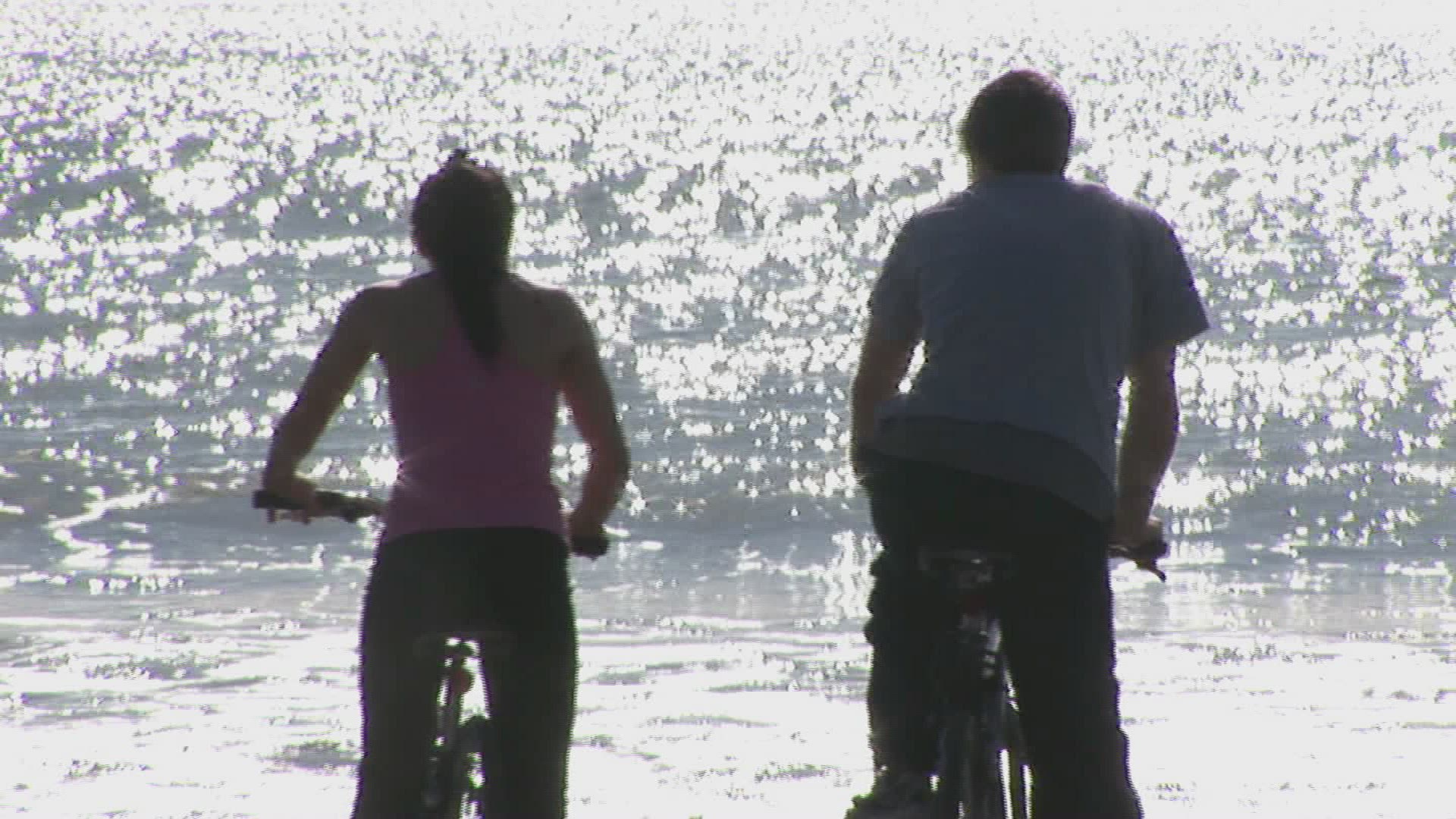 > An older couple rides bikes down the street at sunset as the camera follows them
