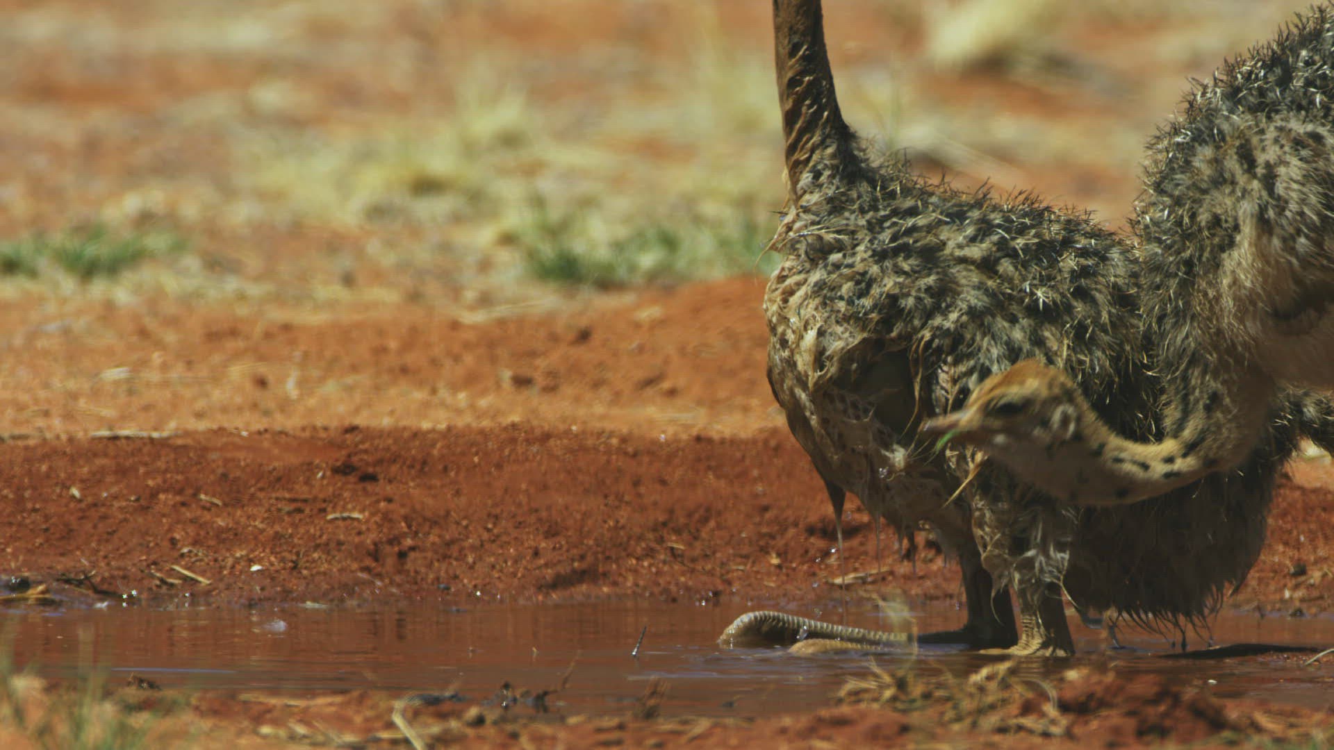 MS SLO MO Two young Ostriches (Struthio camelus) drinking from pond; Kalahari Desert / Namibia