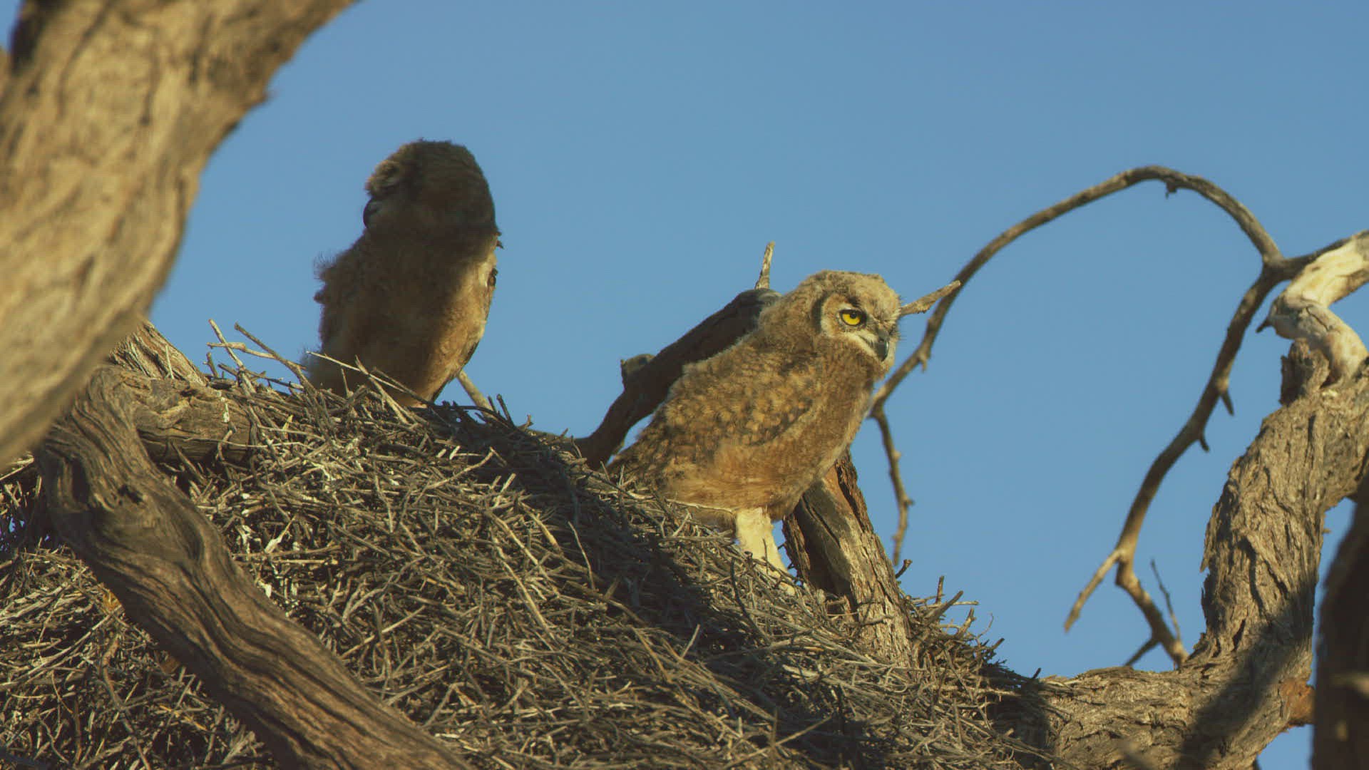 MS Spotted Eagle owls (Bubo africanus) perching in nest; Namib Desert / Namibia
