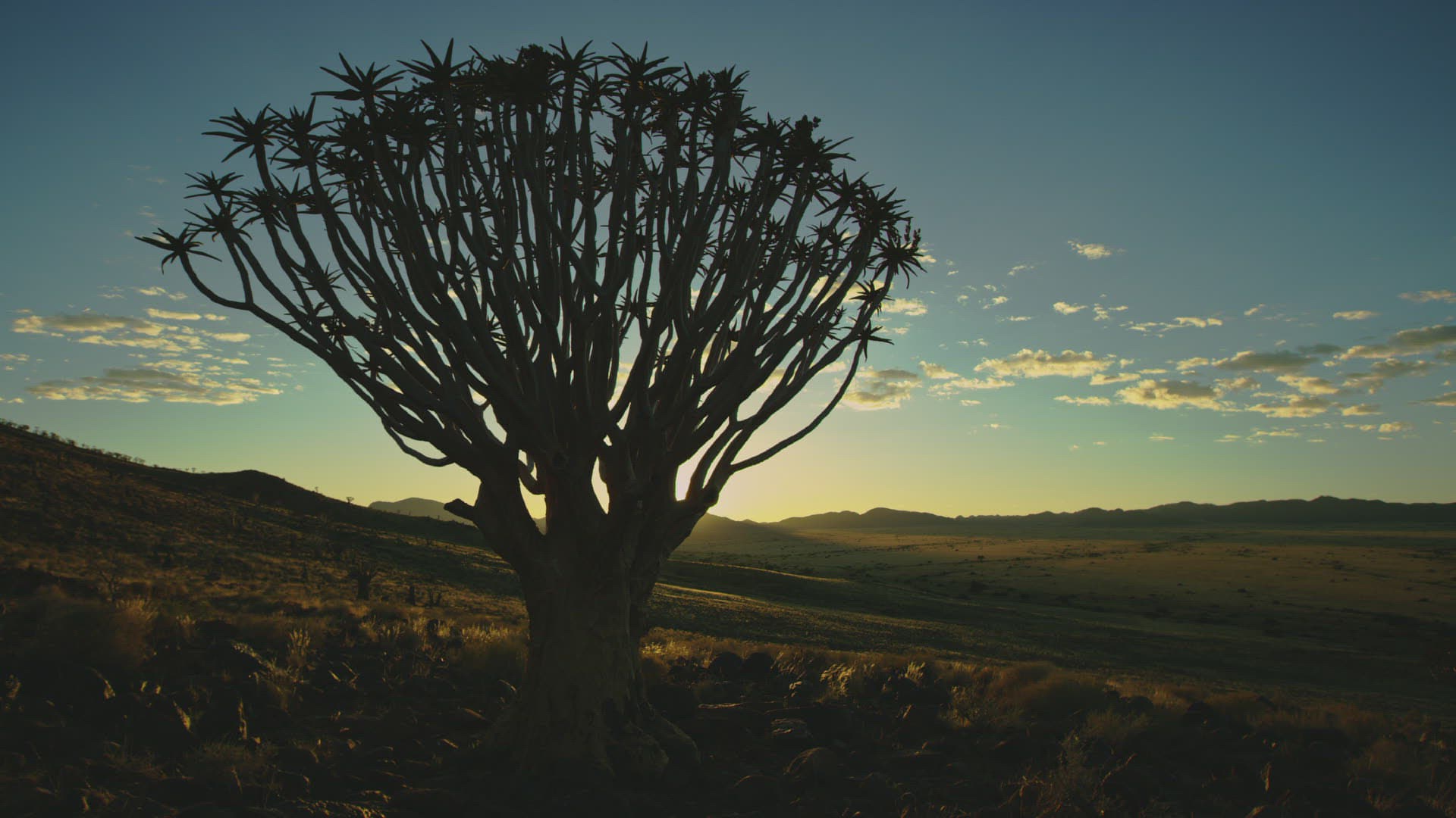 WS DS Silhouette of single Quiver tree (Aloe dichotoma) at sunset; Kalahari Desert / Namibia