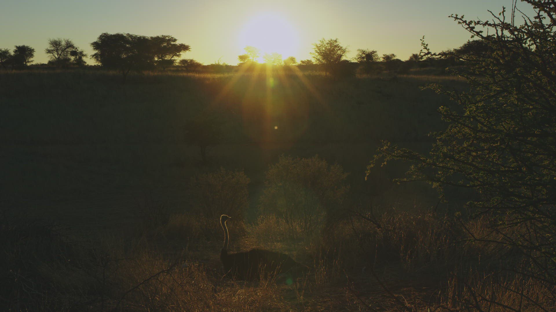 WS Ostrich (Struthio camelus) lying in savannah during sunset; Kalahari Desert / Namibia