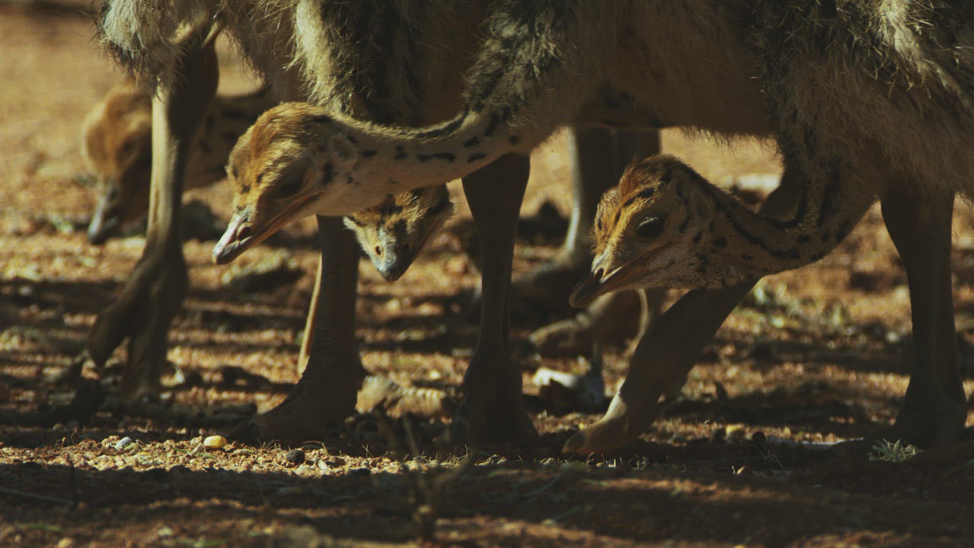 MS PAN SLO MO Young Ostriches (Struthio camelus) grazing in sand; Kalahari Desert / Namibia