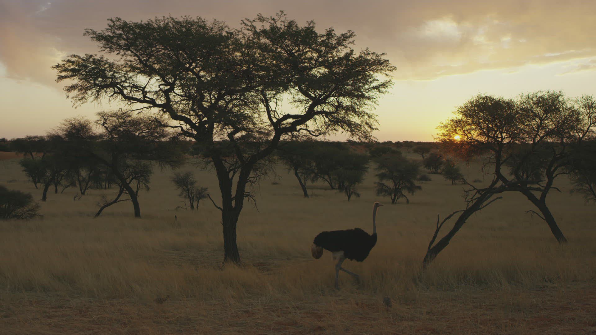 WS Ostrich (Struthio camelus) walking in savannah during sunrise; Kalahari Desert / Namibia