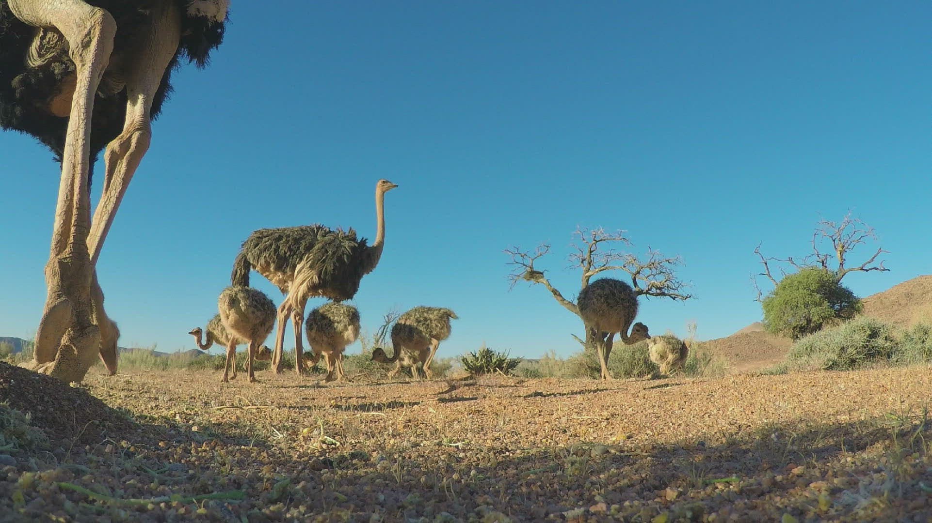 MS LA Ostrich (Struthio camelus) family pecking; Namib Desert / Namibia