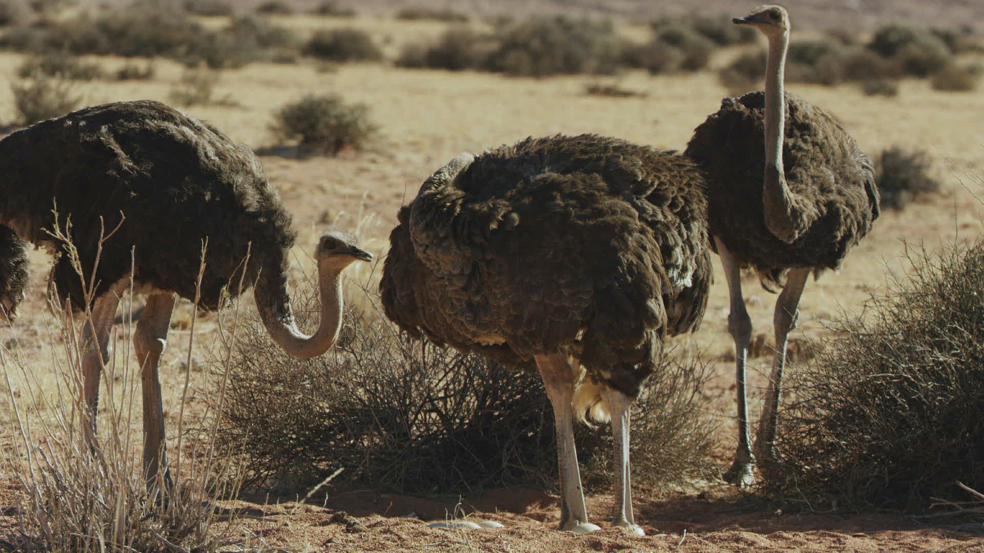 MS Ostriches (Struthio camelus) standing in dry bushes in Namib Desert / Namibia