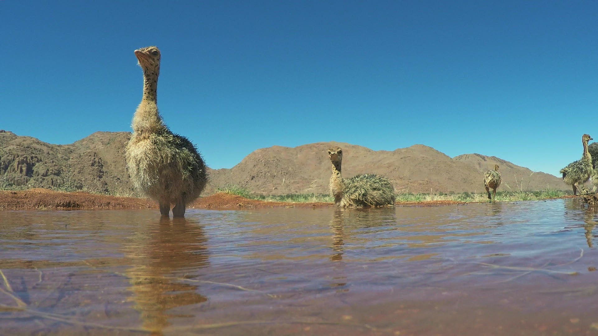 WS SLO MO Ostriches (Struthio Camelus) drinking from lake; Namib Desert / Namibia
