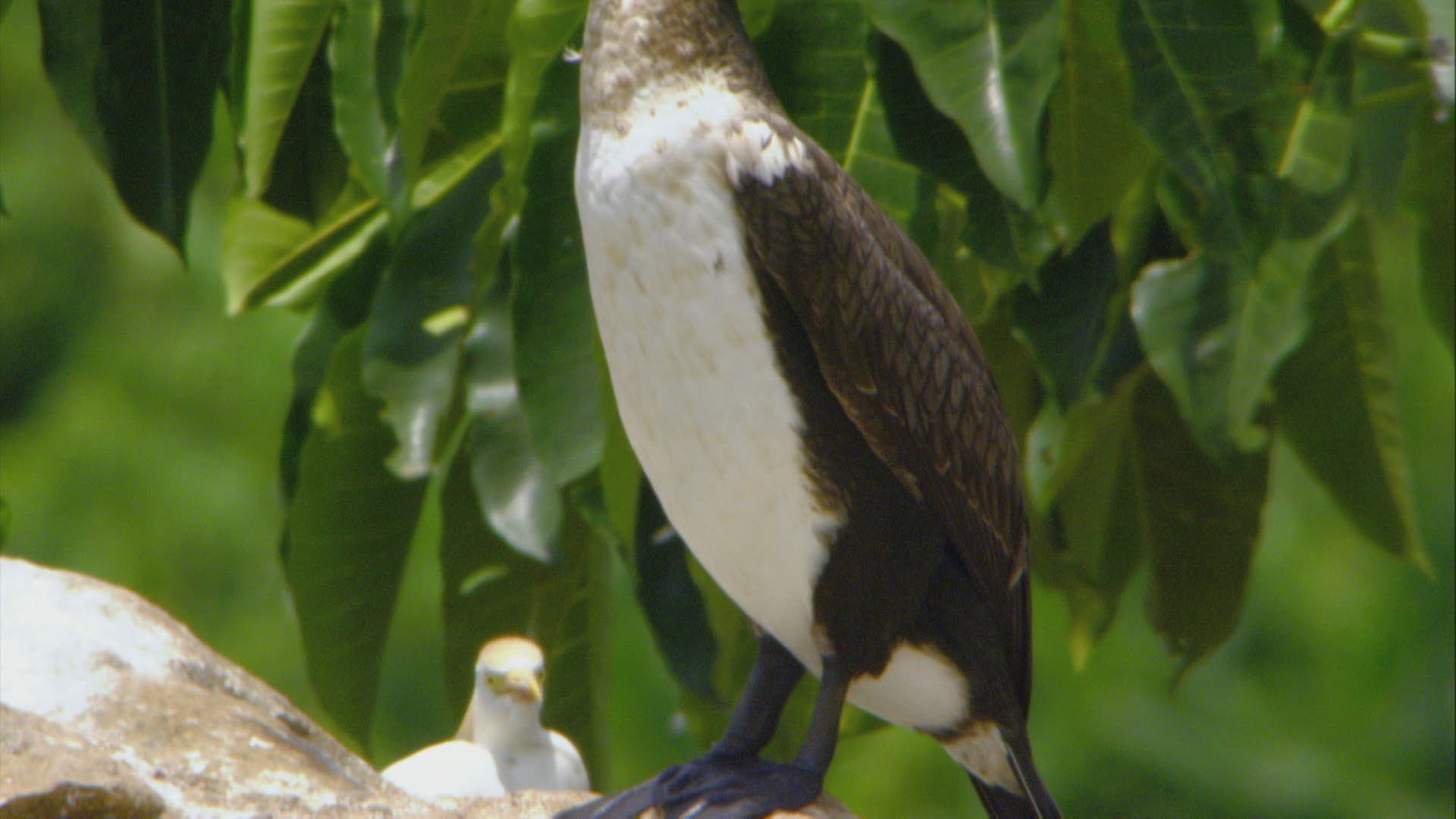 MS TU White-breasted cormorant (Phalacrocorax lucidus) perching on branch with open beak; Western cattle egret (Bubulcus ibis) in background / Uganda
