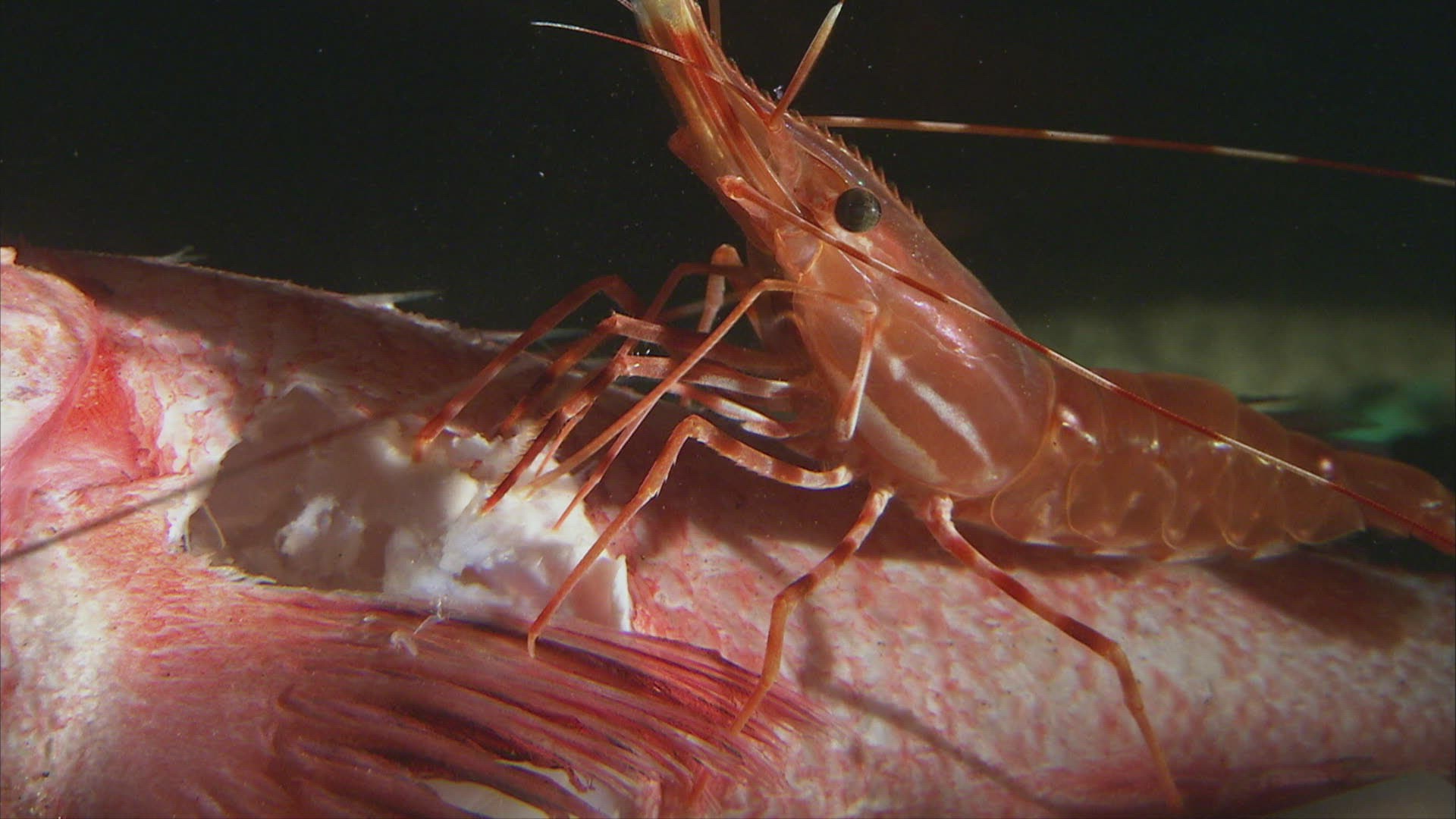 CU Prawn eating dead fish / San Diego; California; USA