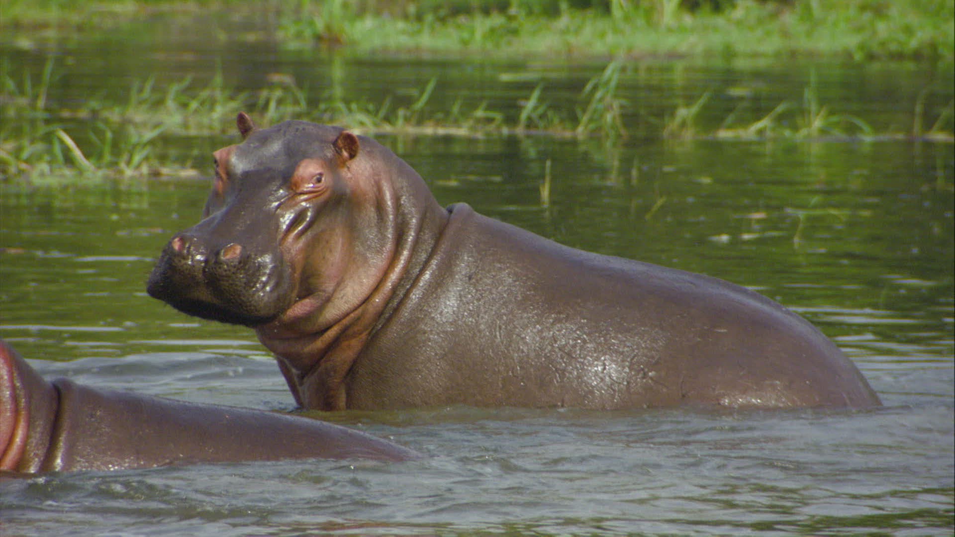MS TS Hippos (Hippopotamus amphibius) swimming in river; Nimule Rapids / Uganda