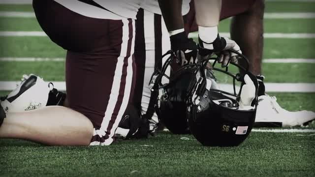 A Football team protects the Quarterback as he passes the ball. Slow motion.