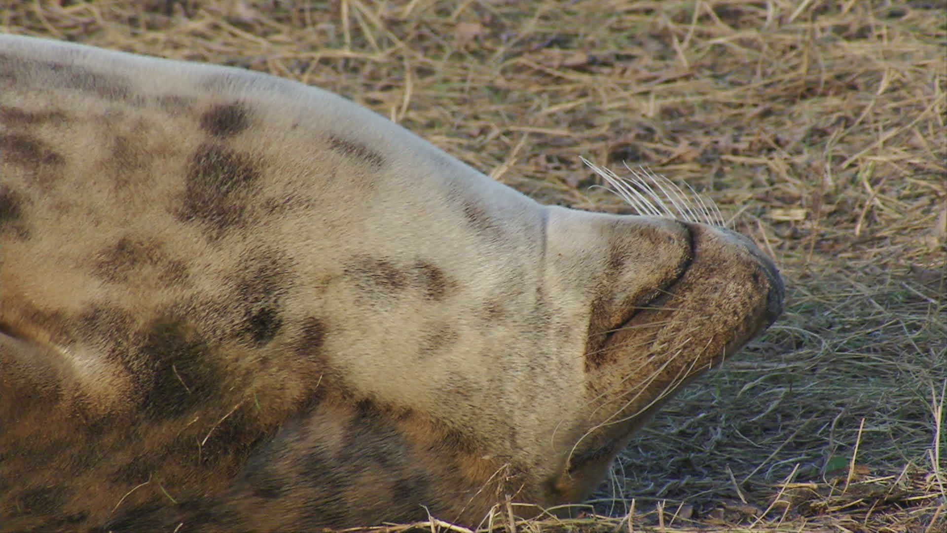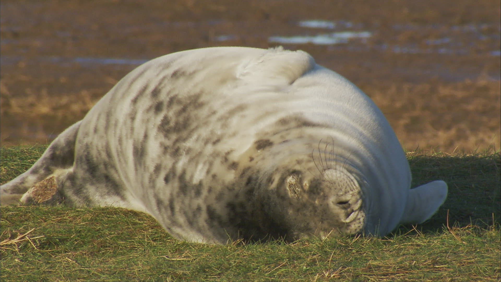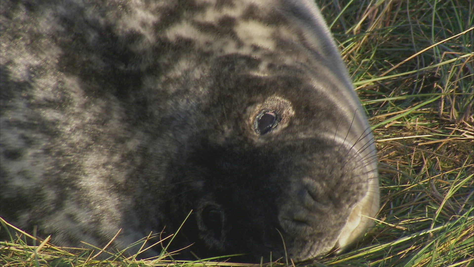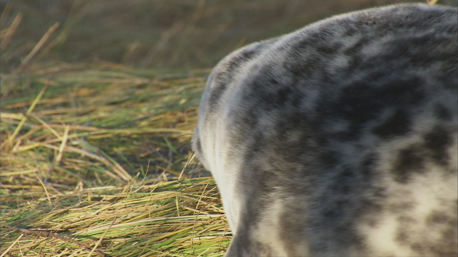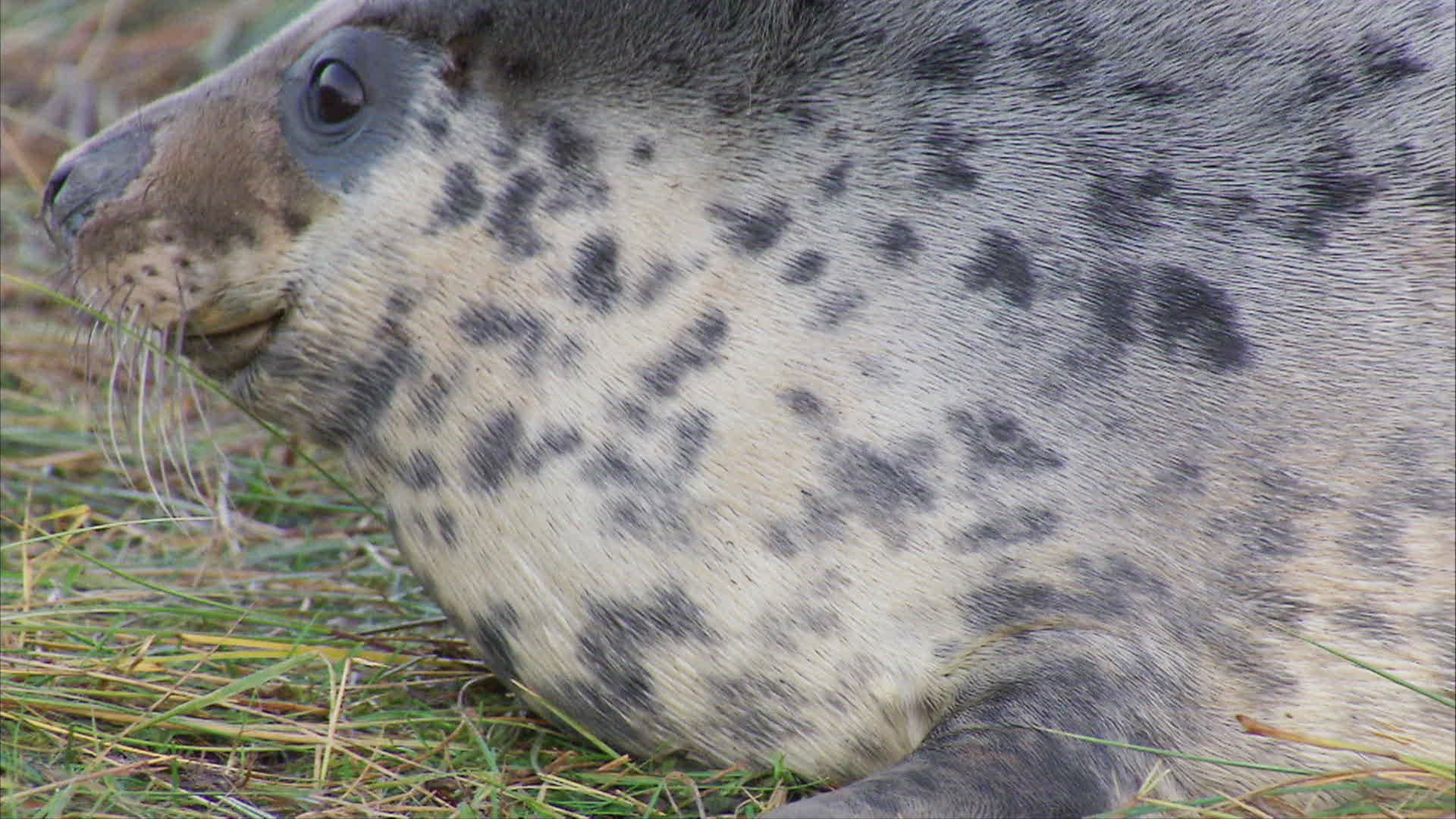 WS Grey seal (Halichoerus grypus) crawling in grass / Pretoria; South Africa